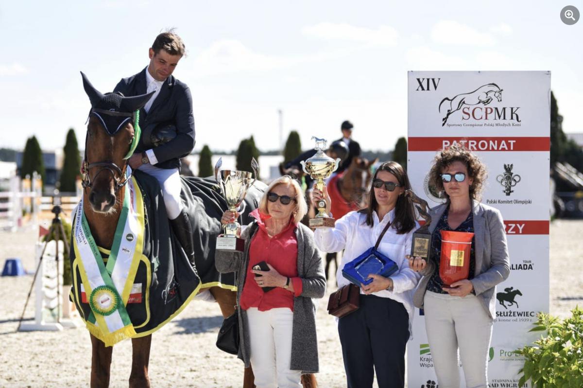 Nagrodę dla najlepszego hodowcy oraz najlepszego konia wyhodowanego w Polsce odebraliśmy również w konkursie dla koni 7-letnich, gdzie zwyciężył sprzedany przez nas, a dosiadany przez swojego właściciela, Jarosława Porębę, wałach Larvik (Flying Dream x Corland), który jako jedyny nie zrobił zrzutki przez całe mistrzostwa.
